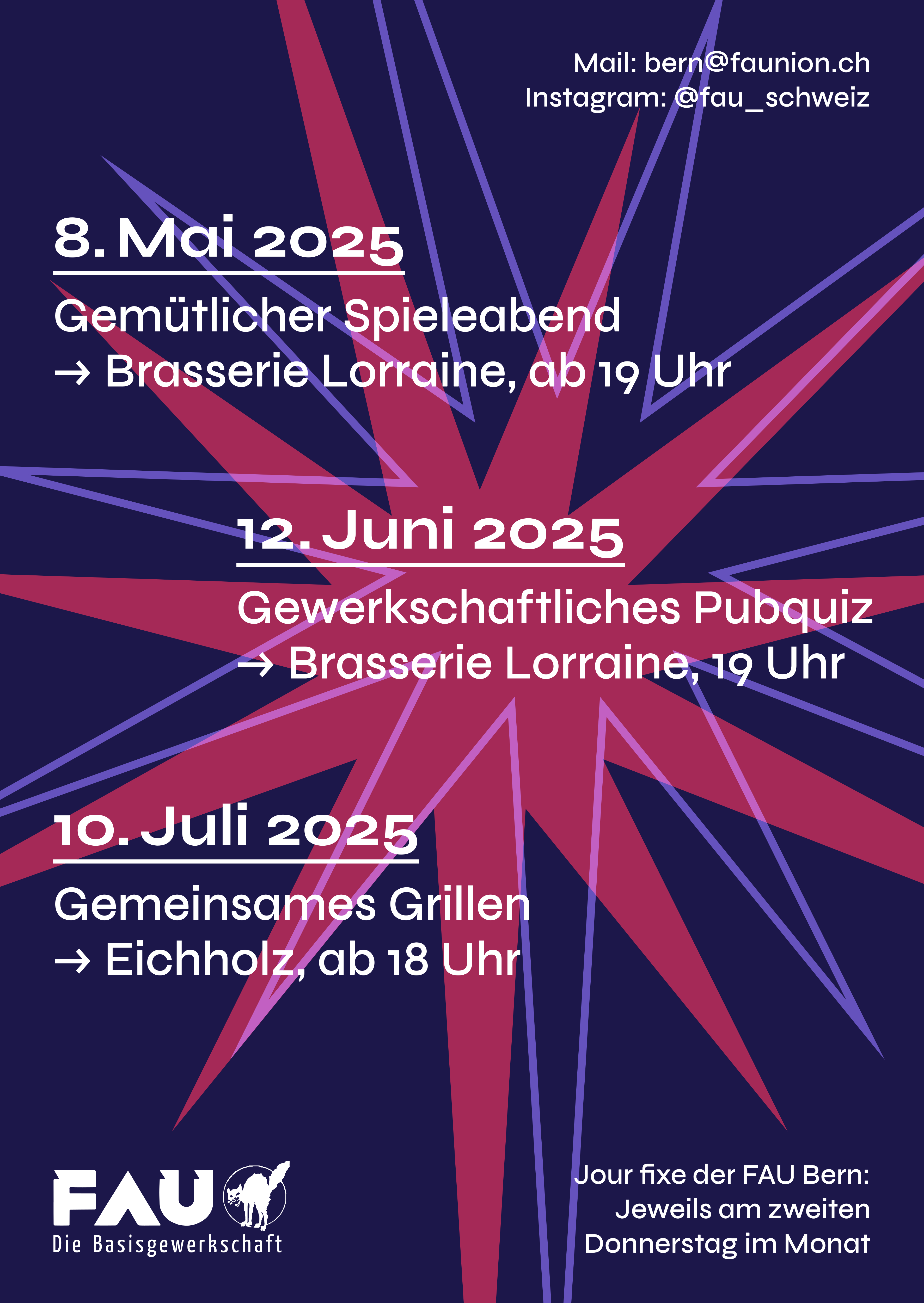 Die FAU Bern veranstaltet jeden 2. Donnerstag im Monat einen Jour Fixe in Bern mit verschiedenem Programm. Hier findest du Mehr infos: