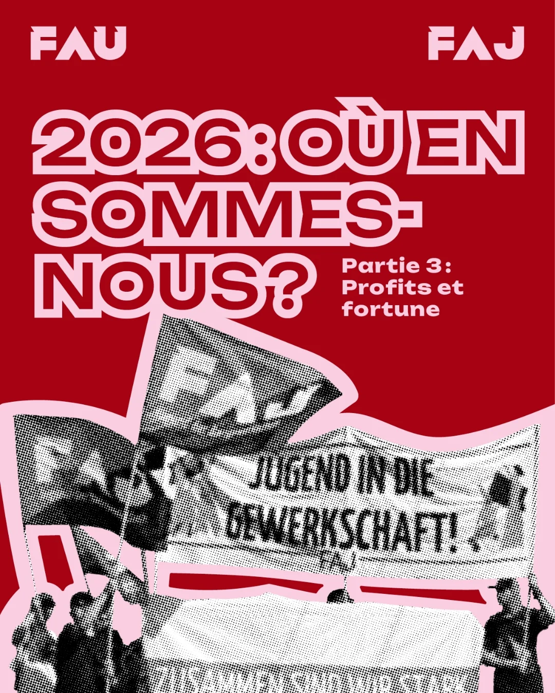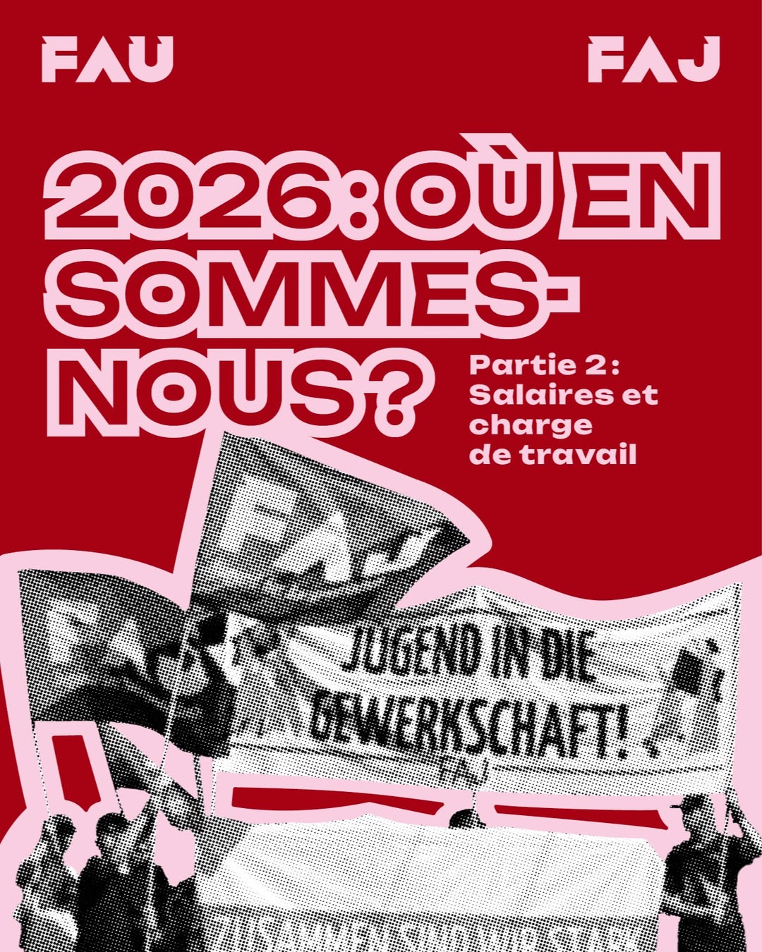 Cette année encore, la FAU et son organisation de jeunesse, la FAJ, seront présentes dans les rues le 1er mai. Tu trouveras ici les lieux de rendez-vous ainsi que le texte de mobilisation 2026